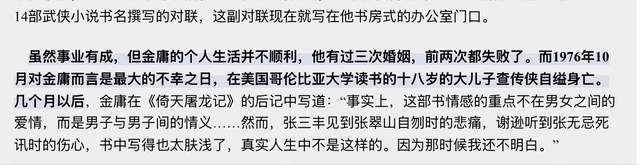为此,金庸翻遍所有经书典籍,试图找到答案,再看自己的小说《倚天屠龙记》里张三丰看到张翠山自尽时的描写,他在后记里写:太肤浅了,真实情况不是这样的,那时我还不明白。