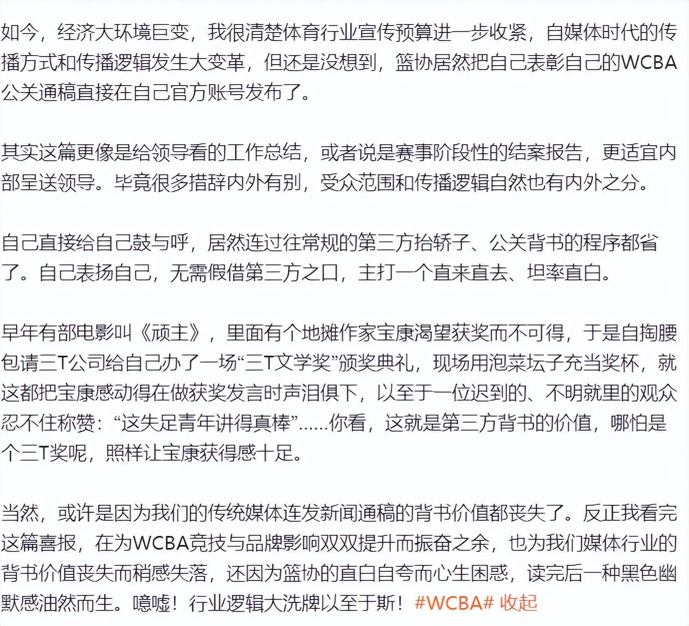 但后来随着自媒体时代的到来,传统媒体的力量也削弱很多,但像篮协这种自卖自夸的行为还是令人觉得非常搞笑。