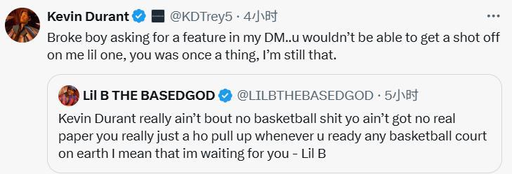 雷速体育6月23日讯 今日,火箭球员杜兰特在社媒中与说唱歌手Lil B再次进行了互怼。